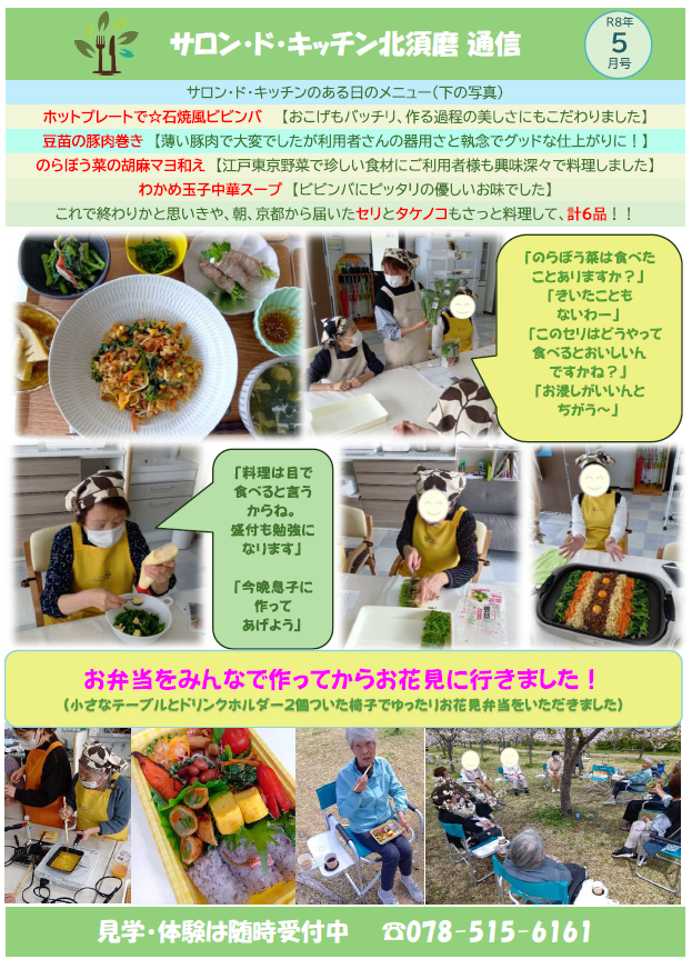 今年のお花見シーズンは天気がすぐれず2日(月曜と木曜)しかお花見に行くことが出来ず、天気が悪い日はお花見ドライブに変更しました。サロン・ド・キッチン北須磨では、お花見は、まず弁当作りから始まります。お弁当箱に詰め切らないほどのおかずを入れたら、さあ出発です。サロン・ド・キッチンは少人数ですので、移動は比較的スムーズです。車2台に分乗し、弁当屋やお茶、椅子をもっていきました。椅子は、このお花見のためにアウトドア用の軽くてしっかりしたものを購入しました。この椅子の優れた点は、お弁当やお茶をおける台がついているところです。でも、カップホルダーが一つではお茶しか置けないので、別付のカップホルダーをもう一つつけることで、お茶だけでなく温かいお味噌汁もお出しすることができました。この椅子のおかげでゆったりとお花を見ながらのお食事を楽しむことが出来ました。ご利用者様も大満足のお花見となりました。日本人にとってお花見は特別なイベントですので、妥協せずに来年も頑張って企画したいと思っています。